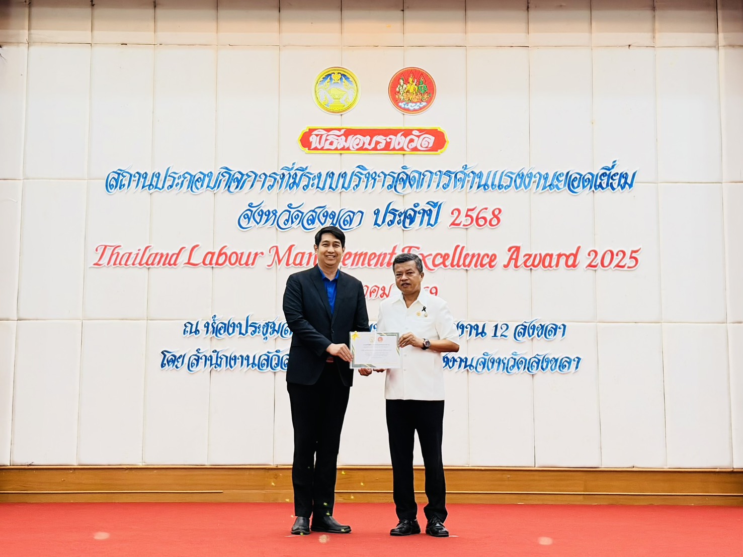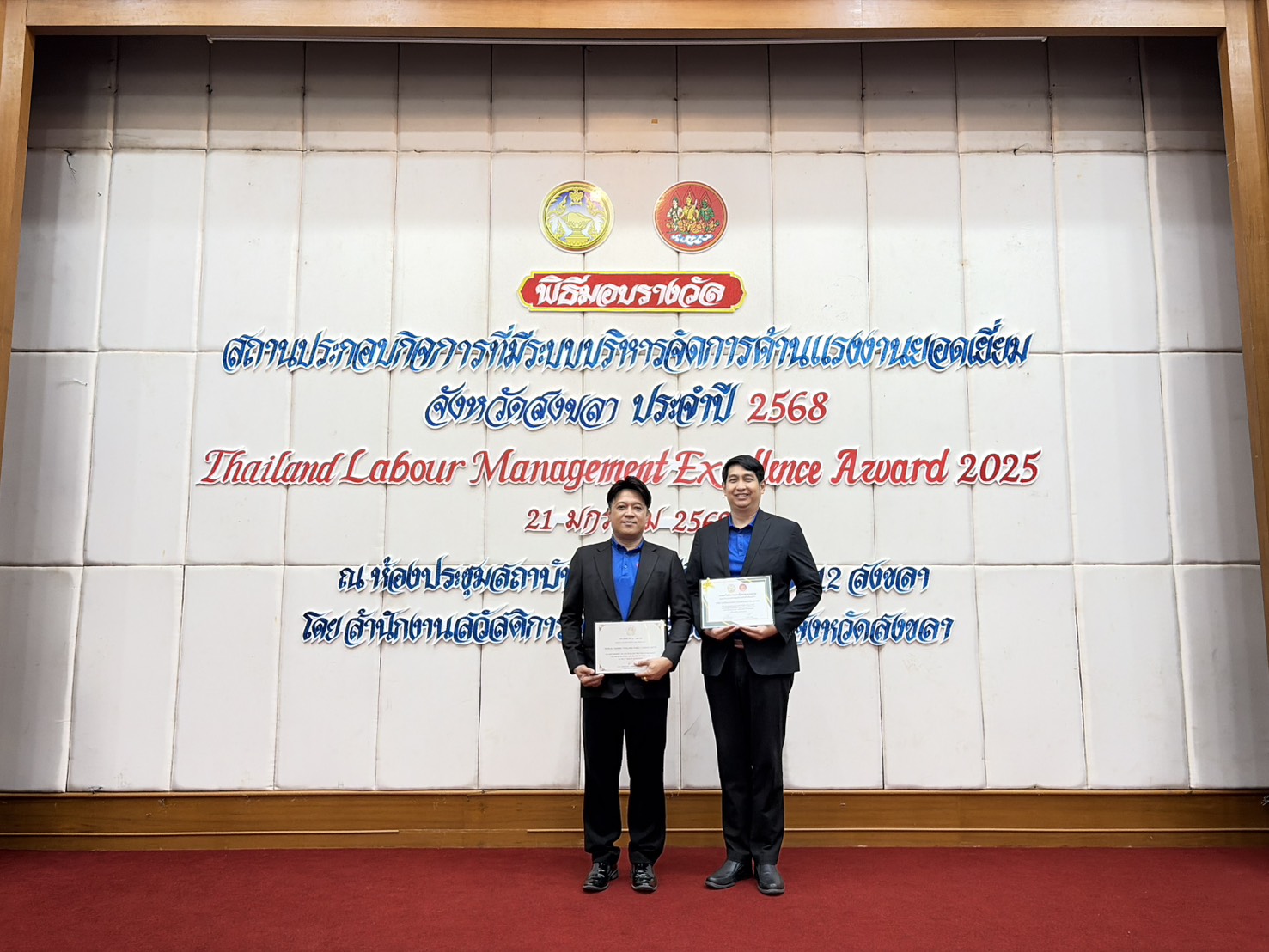 On 21 January 2026, Tropical Canning (Thailand) Public Company Limited, represented by Mr. Panai Chaitada, Executive Director, together with Mr. Chayachat Yossundara, Senior Manager of Human Resources and Company Secretary, received the Thailand Labour Management Excellence Award 2025 from Mr. Ratthasat Chidchu, Governor of Songkhla Province.